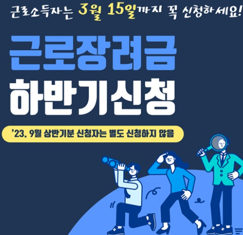 근로장려금 하반기신청이 2024년 3월 15일까지니 잊지 마시고 꼭 신청하세요. 세무서 방문 하시지 마시고 모바일로 바로 신청하시거나 ARS 전화로 신청하셔도 되니 신청못하신 분은 신청하세요!