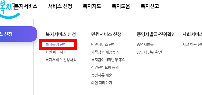 두 번째 서비스 신청에서 복지급여 신청을 클릭해 주세요.