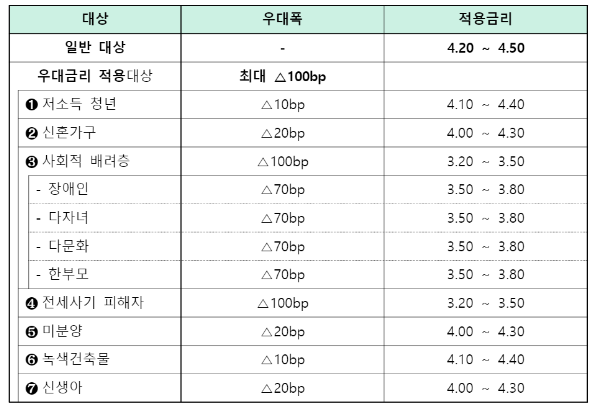 기존 금리보다 인하될 것이며, 최대 100bp 우대 금리를 적용한다고 합니다. 저소득층, 신혼가구, 신생아, 사회적 배려층 등 우대금리 혜택을 알아보겠습니다.