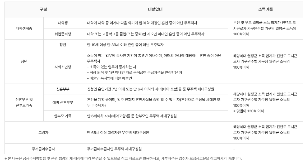 👉 대상자: 청년계층(신혼부부, 대학생, 청년, 신혼부부, 한부모가족) 90%, 주거급여수급자 및 고령자 10%
